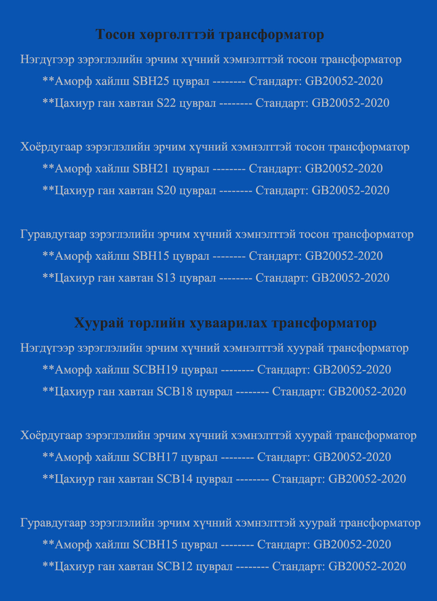 Манай компанийн нийлүүлдэг трансформатор нь өндөр үр ашигтай, бага алдагдалтай, тогтвортой ажиллагаатай, аюулгүй найдвартай, урт хугацаанд ашиглах боломжтой бөгөөд янз бүрийн хүчдэлийн түвшин, ашиглалтын орчинд тохирсон шийдлийг санал болгодог.